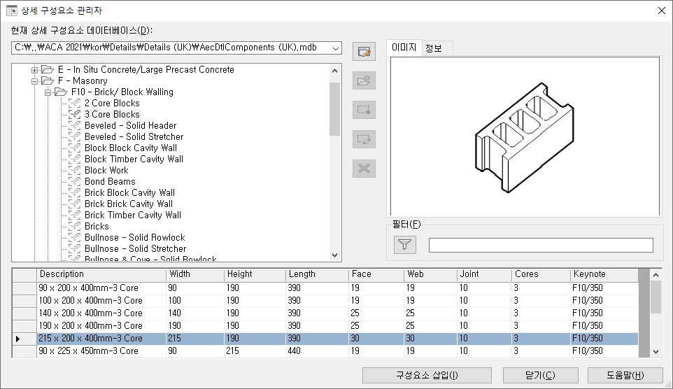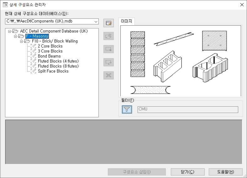 콘크리트 석조 테이블이 표시된 상세 구성요소 관리자 대화상자