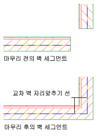 - 교차하는 벽 세그먼트는 명확한 구석 조건에서 교차하는 벽 자리맞추기 선과 만나도록 잘립니다.