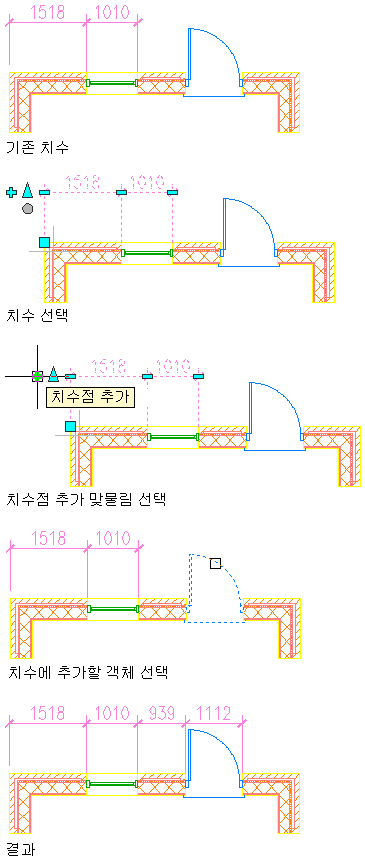 선택한 객체에 AEC 치수 스타일로 지정된 치수점이 없을 경우에는 객체의 기준점 위치에서 치수점이 추가됩니다.