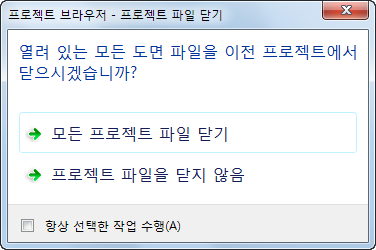 을 클릭했을 때 항상 프로젝트 네비게이터를 닫고, 프로젝트 환경을 종료하고, 모든 프로젝트 파일을 연 상태로 유지 항상 선택한 작업 수행을 선택한 다음 프로젝트 파일을 닫지 않음을 클릭합니다.