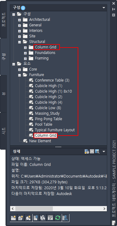 구성을 작성한 후에야 이 구성이 실제로 반복 요소임을 인식할 수도 있습니다. 예를 들어, 기둥 그리드를 작성한 후 다른 바닥에 지금 사용하려고 합니다. 구성을 쉽게 요소로 변환하고 다중 구성에 참조할 수 있습니다.