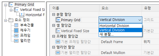 분할은 그리드 방향(그리드 셀 및 멀리언의 방향이 수직인지 또는 수평인지 여부) 및 분할 유형(셀의 개수 및 크기)를 정의합니다.
