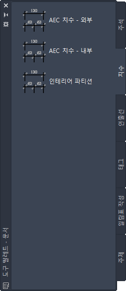CAD 관리자 또는 다른 사용자가 작성한 사용자 팔레트는 프로젝트나 사무용 표준에 맞게 사용자화된 AEC 치수 스타일 및 특성을 가진 AEC 치수 도구를 포함할 수도 있습니다.