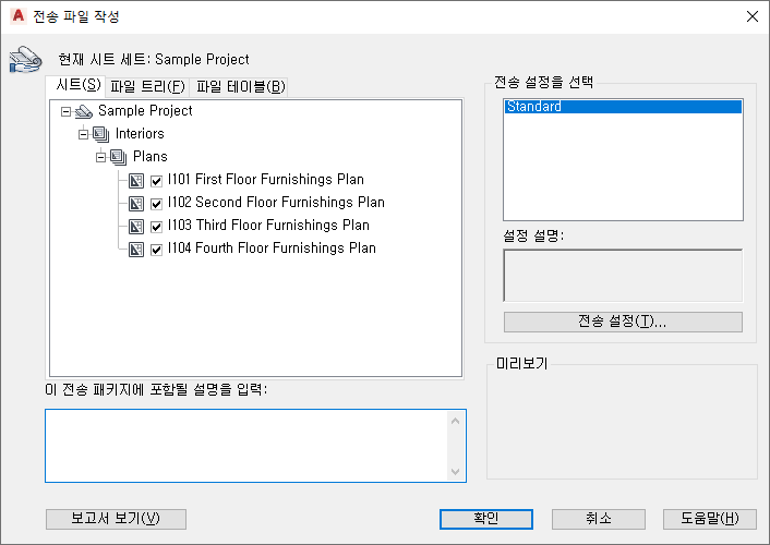 파일 세트를 전자 전송한다는 것은 전자 파일 형식으로 발송하기 위해 파일 세트를 패키지로 만든다는 의미입니다. 전송 패키지의 도면 파일은 외부 참조 및 글꼴 파일과 같은 모든 관련 종속 파일을 포함합니다.