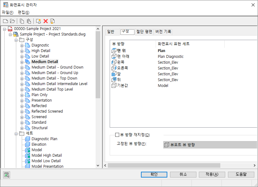 화면표시 관리자를 사용하여 각 뷰 방향에 지정된 화면표시 세트를 식별할 수 있습니다. 화면표시 관리자는 화면표시 시스템의 요소를 관리하기 위한 유틸리티입니다. 다음 그림은 두 화면표시 구성인 중간 상세 및 표준을 사용하는 도면을 보여줍니다.