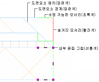 - 도면요소: 이 구성요소는 구성요소를 내부 편집하는 객체의 화면표시를 제어합니다. 예를 들어 벽 끝마감을 내부에서 편집하는 경우 이 화면표시 구성요소는 벽 경계를 제어합니다.