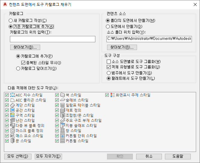 이 옵션은 다양한 도면의 스타일을 팔레트나 카탈로그에 병합하려는 경우에 적합합니다. 결과로 생성된 도구는 "벽", "문" 등과 같이 스타일 유형의 이름을 딴 범주 또는 팔레트에 배치됩니다.