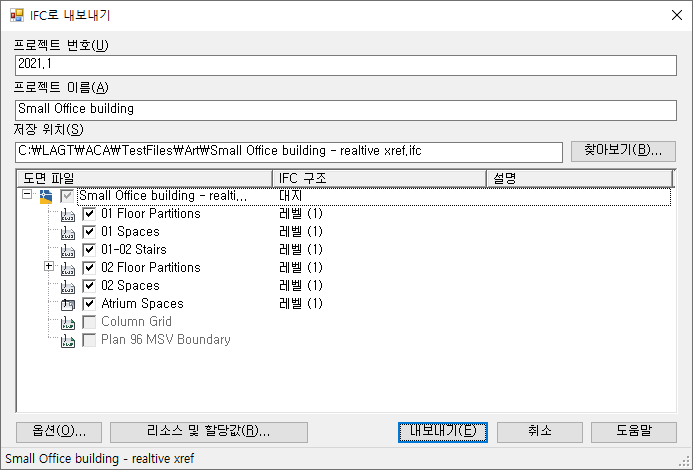 다음 과정에 따라 도면을 IFC 파일로 내보내고 선택한 외부 참조를 포함시키십시오. 내보낼 도면이 도면 화면에 활성화되어 있어야 합니다. 이 도면은 기본적으로 (Ifc)Site에 매핑됩니다.
