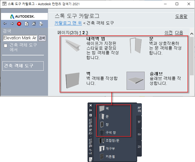 다음 절차에 따라 컨텐츠 검색기의 카탈로그에서 AutoCAD Architecture 2021 toolset의 도구 팔레트로 도구를 링크하십시오.