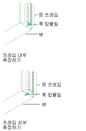 | 측정 대상 | 문의 폭과 높이가 문 프레임 내부 또는 외부까지 측정되는지 여부를 지정합니다. 문이 프레임 외부까지 측정되는 경우에는 문이 프레임에 대해 뺀 양만큼 작습니다. 그림![]() |
