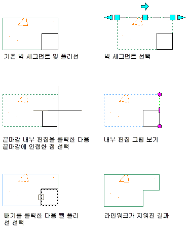 다음 과정에 따라 구성요소에서 프로파일을 빼서 벽 끝마감을 수정하십시오. 프로파일은 특정 구성요소와 겹치는 모든 폴리선-닫힌 영역일 수 있습니다.