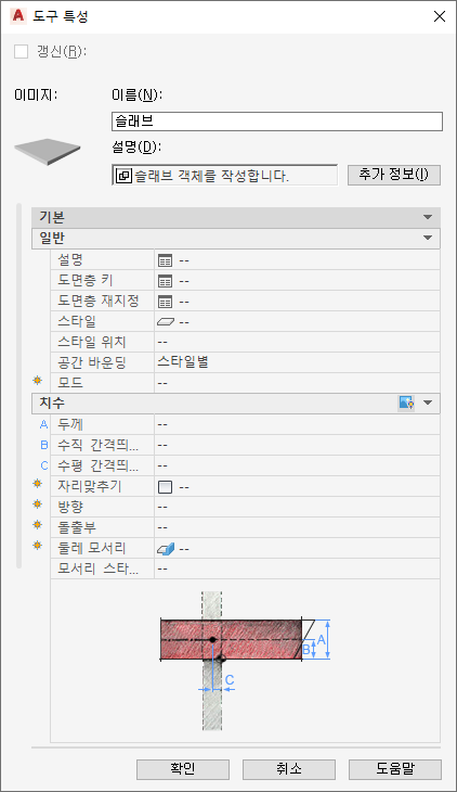 슬래브 모서리 스타일이 기본값으로 설정되어 있는 슬래브 도구 특성