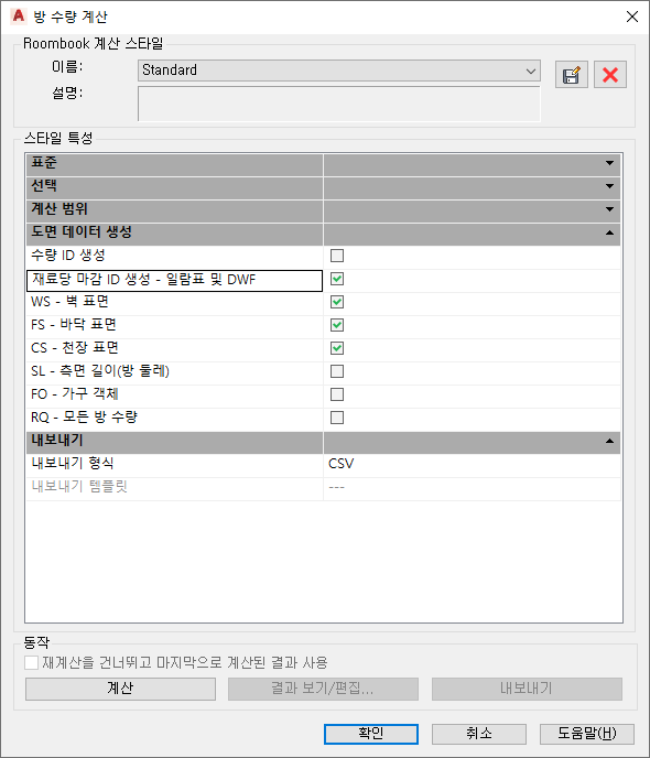 - 방 수량 계산 대화상자의 스타일 특성 아래, 도면 데이터 생성 리스트에서 재료당 마감 ID 생성을 선택합니다.