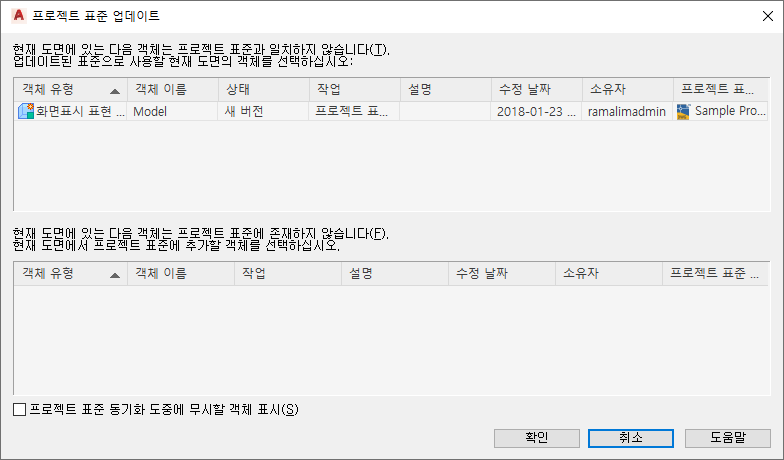 이 경우 프로젝트 표준 도면의 버전은 프로젝트 도면의 버전으로 덮어쓰지 않습니다. 다음에 프로젝트 도면을 동기화하는 동안 화면표시 설정은 프로젝트 표준과 동기화되지 않은 것으로 표시됩니다.