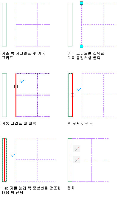 동일선상 구속조건을 사용하여 벽의 중심선을 기둥 그리드 선과 정렬합니다.