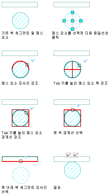 구속할 AEC 객체를 선택할 때 Tab 키를 눌러 옵션을 전환할 수 있습니다. 선택할 수 있는 유효한 객체 도면요소가 빨간색 선으로 강조 표시됩니다.