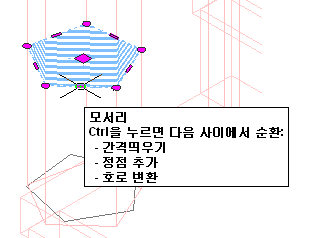 | 그립을 사용하여 프로파일 편집 | 필요에 따라 모서리 또는 정점 그립을 이동합니다. 모서리 그립에는 간격띄우기, 정점 추가 및 호로 변환의 세 가지 편집 모드가 있습니다. 기본 모드는 간격띄우기로, 모서리의 중간점과 수직 방향으로 선택된 모서리를 간격띄우기합니다. 프로파일의 쉐이프 및 수정하려고 선택한 모서리에 따라 주변 선이 연장되거나 잘리고 필요에 따라 새 선이 추가됩니다. 정점 추가 편집 모드를 사용하여 선택된 모서리에 정점을 추가하고 새 모서리를 작성합니다. 선택한 모서리가 호이면 새 모서리도 호입니다. 호로 변환은 선택된 모서리를 호로 변경하고 모서리의 중간점을 신축합니다. 호의 모서리 그립도 신축 모드를 가지므로, 모서리가 호로 변환된 후 모서리의 중간점을 신축할 수 있습니다. |