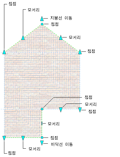 | 지붕 선 또는 바닥판 선의 쉐이프 변경 | 프로파일을 선택한 후 지붕 선 이동, 바닥선 이동 및 모서리 그립을 사용하여 쉐이프를 조정합니다. |