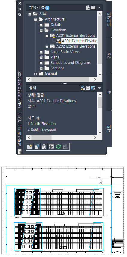 시트 세트, 시트, 시트 뷰, 시트 도면 및 모형 공간 뷰는 프로젝트 네비게이터의 시트 및 뷰 탭에 나열됩니다.