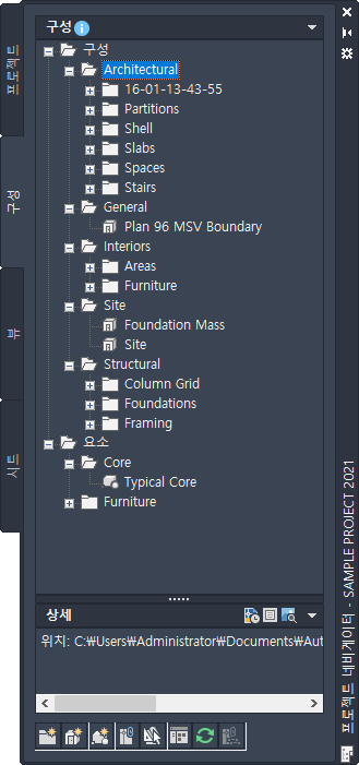 건물을 구성하는 데 유용하도록 구성, 뷰 및 시트와 같은 건물 프로젝트의 구성요소를 범주화할 수 있습니다. 쉘, 코어 및 내부 칸막이와 같은 범주를 사용할 수 있습니다. 구성을 범주화하면 뷰를 생성할 때 해당 구성을 필터링할 수 있습니다.