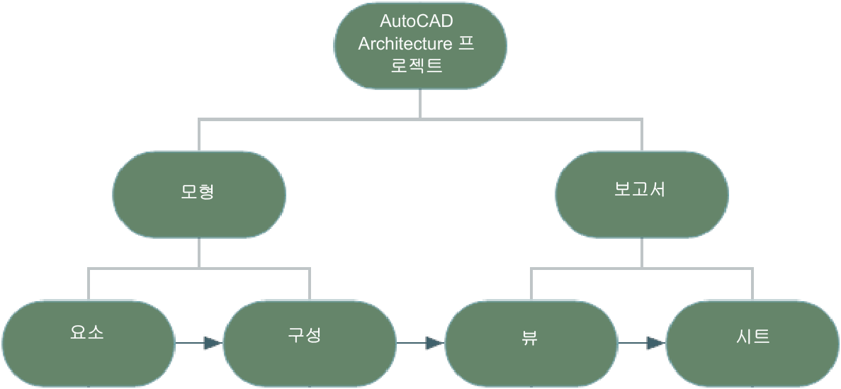 AutoCAD Architecture 2021 toolset 프로젝트는 기본 XML 구조를 가집니다. 작성할 각 도면 파일(예: 바닥 도면이나 구조 도면)의 경우 XML 파일이 함께 작성됩니다. XML 파일에는 레벨 및 부속건물 정보와 같은 프로젝트 관련 정보가 들어 있습니다. 도면 파일 자체는 프로젝트 관련 정보를 포함하지 않으므로, 프로젝트 내에서 작성한 도면 파일을 프로젝트 외부에서도 다시 사용할 수 있습니다.