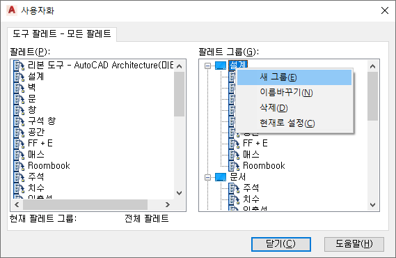 팁: 사용자화 대화상자는 프로젝트 팔레트 그룹에 팔레트를 추가할 때 매우 유용합니다.
