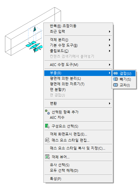 본체 수정자를 내부에서 편집하는 동안 그립으로 수정자 쉐이프를 변경하고 부울 명령을 사용하여 본체 수정자에서 다른 객체를 추가 또는 제거할 수 있습니다.