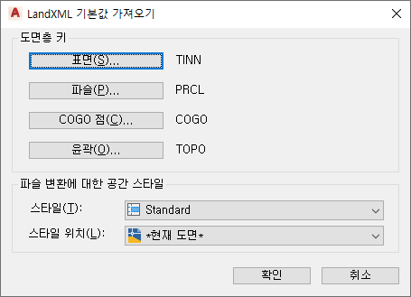 LandXML 파슬을 공간으로 가져오는 경우 필요에 따라 공간 스타일 및 스타일 위치를 선택합니다.
