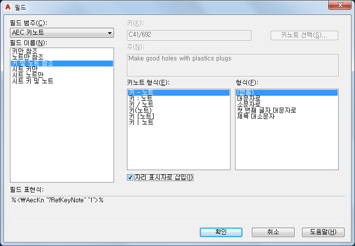 - 필드 대화상자에서 현재 필드 범주가 AEC 키노트인지 확인한 후 필드 이름에서 키노트 형식을 선택합니다. 키 및 노트 옵션 중 하나가 선택된 경우, 키노트 형식에서 옵션을 선택할 수 있습니다. 또한 원하는 경우 형식 아래 설정을 변경할 수 있습니다.
