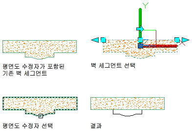 수정자를 적용할 때 벽 또는 벽 구성요소의 반대편 면까지 수정자의 간격을 띄우려면, 각각의 면에서 벽 수정자를 제거해야 합니다.
