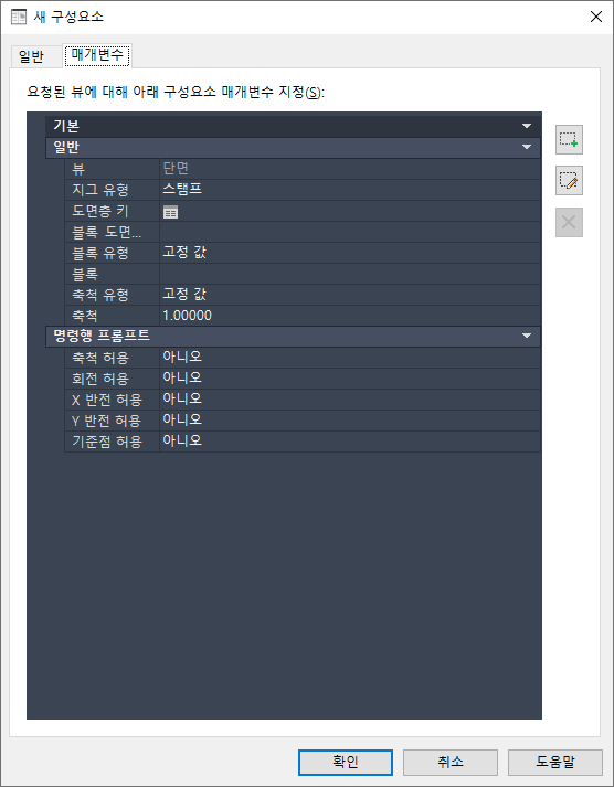 다음 과정에 따라 상세 구성요소 데이터베이스에 구성요소를 추가하고 빈 크기 테이블을 작성합니다. 그런 후 이 테이블에 구성요소를 사용할 수 있는 크기를 나타내는 행을 추가할 수 있습니다. 구성요소를 추가할 때 새 구성요소 대화상자의 일반 및 매개변수 탭에 지정한 값은 여러 다른 뷰에 구성요소를 그리기 위한 하나 이상의 레시피를 작성하는 데 사용합니다. 각 레시피는 특정 뷰에 구성요소를 배치하기 위한 지그 또는 도면 루틴 유형을 지정합니다. 레시피에 도면층 및 해치 패턴과 관련된 정보도 포함되어 있을 수 있습니다.