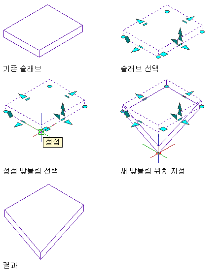 다음 과정에 따라 슬래브 또는 지붕 슬래브의 정점 중 하나를 이동하여 크기나 쉐이프를 변경하십시오.