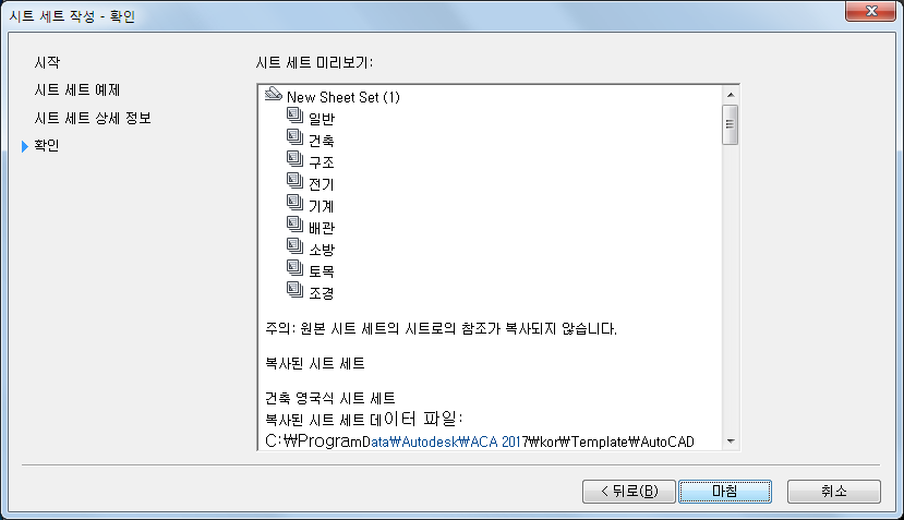 | 시트 세트 템플릿 작성 완료 | 마침을 클릭합니다. |