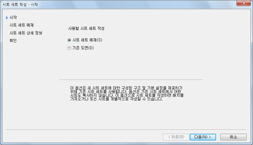 시트 세트 작성 마법사가 표시됩니다. 마법사를 사용하여 새 시트 세트 템플릿을 작성할 수 있습니다.