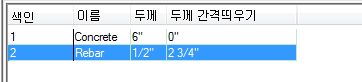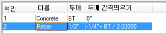 그림과 같이 기본 두께만 사용하는 간단한 수식을 작성할 수도 있고 수식에서 기본 두께에 추가할 값을 지정하거나 기본 두께를 포함하는 추가 수학 연산을 지정할 수도 있습니다. 오른쪽의 연산 드롭다운 메뉴와 피연산자 상자는 기본 두께를 선택한 경우에만 사용할 수 있습니다. 변수 두께 콘크리트 슬래브 가운데에 1/2'' 철근을 배치하는 경우 철근 두께 간격띄우기의 수식은 다음과 같이 구성됩니다.