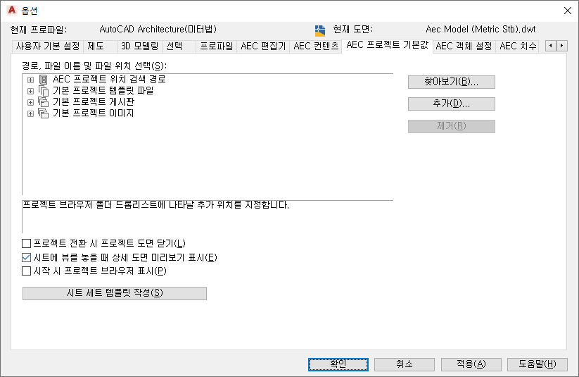 | AutoCAD Architecture 2021 toolset를 열 때마다 프로젝트 브라우저가 열리도록 지정 | 시작 시 프로젝트 브라우저 표시를 선택합니다. |