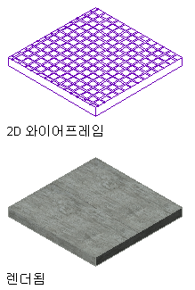 슬래브 또는 지붕 슬래브에 재료를 지정할 수 있습니다. 예를 들어, 바닥판 슬래브에는 콘크리트 모서리를 가진 타일을 표시하는 재료가 지정될 수 있습니다. 그런 다음, 해당 재료가 와이어프레임이나 렌더된 보기에 표시됩니다. 재료에는 본체, 페이셔 및 밑면과 같은 슬래브 또는 지붕 슬래브의 개별 구성요소에 대한 특정 설정이 있습니다.