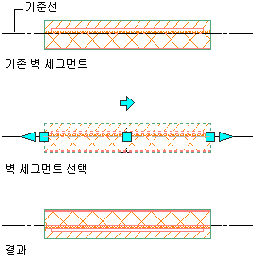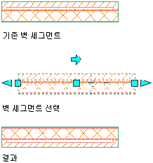 벽 자리맞추기 선을 반전하면 도면의 벽 위치는 변경되지만, 도면의 기준선 위치는 동일하게 유지됩니다. 폴리선 또는 공간에서 벽을 작성할 때 이 방법을 사용합니다. 이런 경우 기준선 위치는 변경하지 않으려는 중요한 형상이 될 수 있습니다.