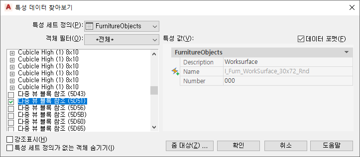 | 객체 또는 객체 스타일에 부착된 특성 세트를 선택할 때 도면에서 객체 강조하지 않음 | 강조 선택을 해제합니다. |