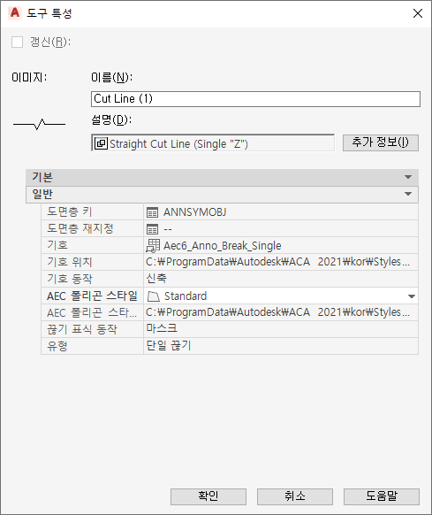| AEC 폴리곤 스타일 | 끊기 표식에 마스크 특성을 사용할 것인지 지정합니다. 이 특성을 지정하지 않으면(--) 표준 스타일이 기본 스타일이 됩니다. |