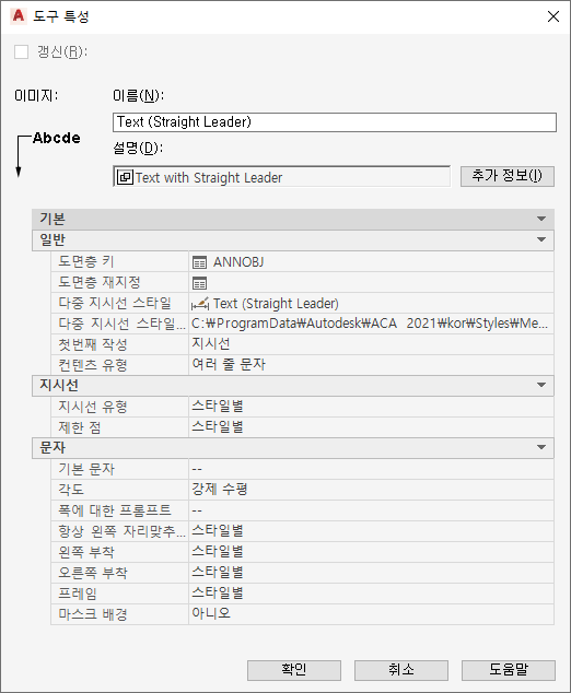 | 지시선/제한 점 | 지시선 유형이 지정된 경우에만 표시되는 특성이며, 지시선에서 점의 개수가 제한되는지 나타냅니다. 지정되지 않은(--) 경우, 현재 도면에 해당하는 지시선 설정이 사용됩니다. |