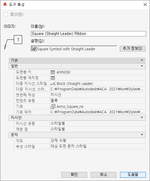 | 지시선/지시선 치수 스타일 위치 | 현재 도면 치수 스타일과 다를 경우 치수 스타일의 위치를 지정합니다. 특성을 클릭한 다음 드롭다운 리스트에서 찾아보기 옵션을 사용하여 선택한 스타일의 경로를 찾아 입력합니다. 이 특성이 지정되지 않은(--) 경우, 현재 도면의 스타일만 사용됩니다. |