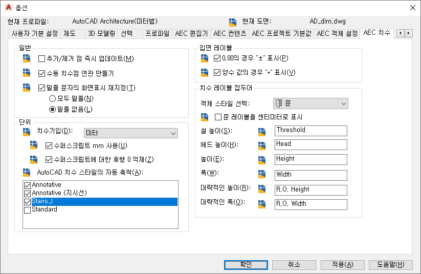 AEC 치수에 대한 설정에는 다음이 포함됩니다.