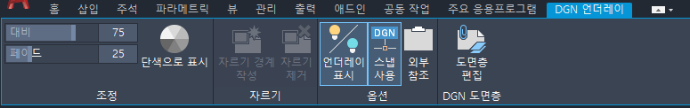 도면에서 DGN 언더레이를 선택하면 DGN 언더레이 상황별 탭이 리본에 표시됩니다.