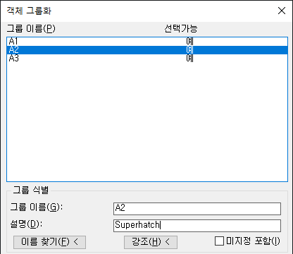 3) 그룹을 선택합니다. SUPERHATCH에 의해 작성된 그룹의 설명 필드에는 "superhatch"가 표시됩니다.