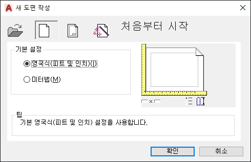 새 도면의 단위 및 영역을 지정할 수 있는 신속 설정 마법사를 표시합니다. 신속 설정 마법사는 또한 문자 높이 및 스냅 간격과 같은 설정을 알맞은 축척으로 변경합니다.