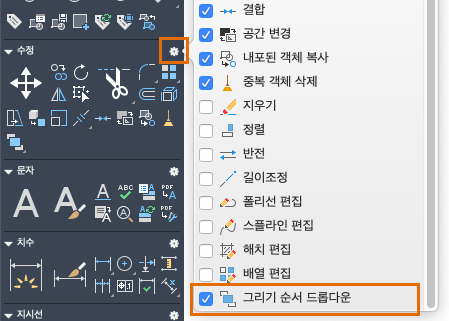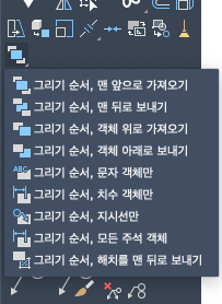 드롭다운을 확장하면 모든 해치를 맨 뒤로 보내기, 선택된 객체를 맨 앞으로 보내기 등의 그리기 순서 옵션이 표시됩니다.