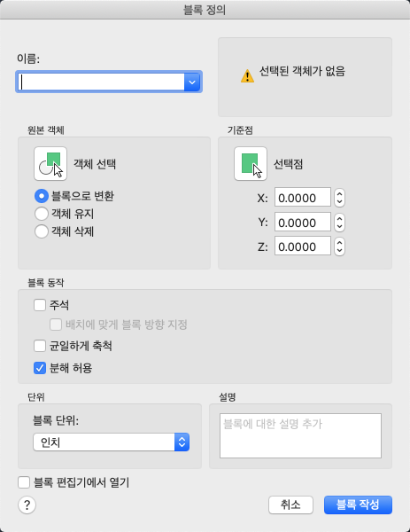 새 블록에 포함시킬 객체를 지정하고 블록을 작성한 후 선택된 객체를 유지할지, 삭제할지 아니면 블록 복제로 변환할지를 지정합니다.