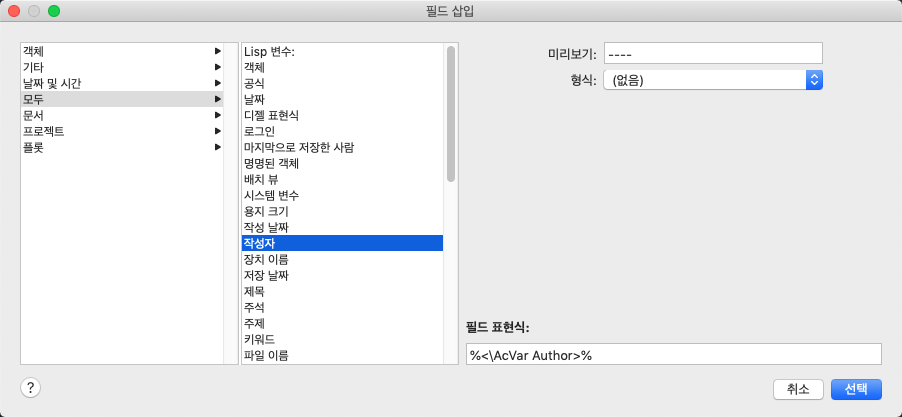 필드 삽입 대화상자