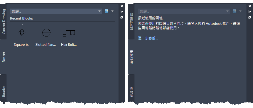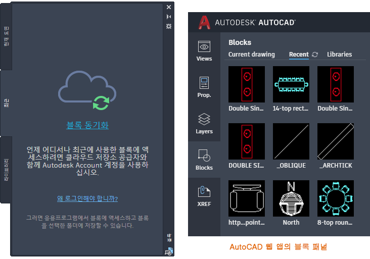 지원되는 클라우드 저장소 공급자(Box, 드롭박스(Dropbox) 또는 Microsoft OneDrive)와 함께 Autodesk Account 계정을 사용하여 최근 블록 및 블록 라이브러리 도면에 언제 어디서나 빠르게 액세스할 수 있습니다.